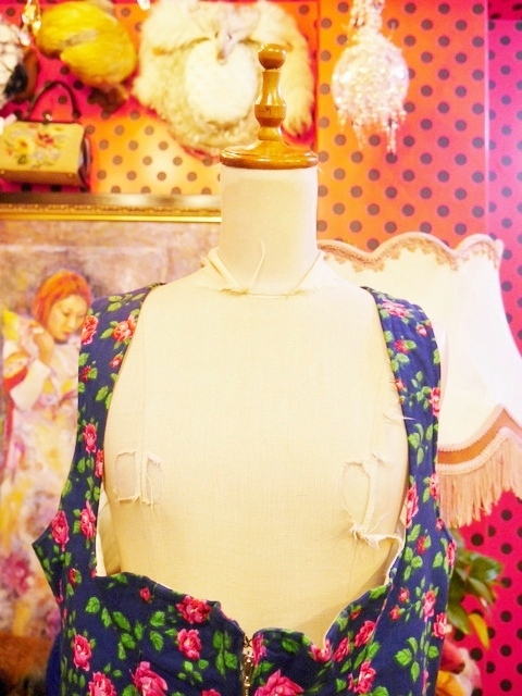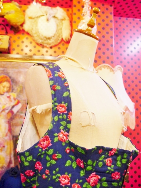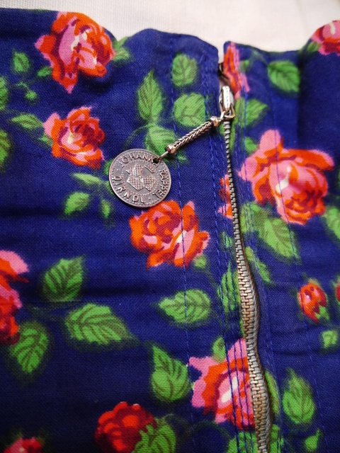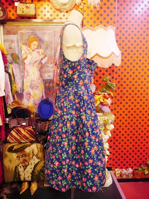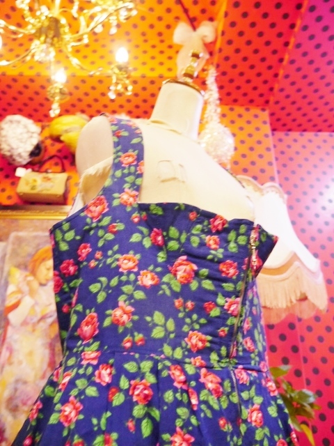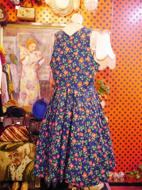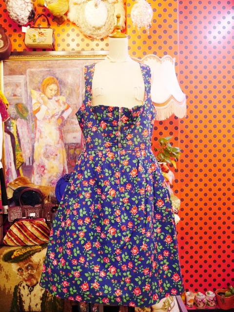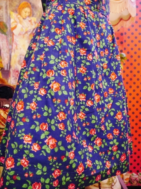 ドイツ南部からオーストリアチロル地方にかけての民族衣装ディアンドル 青ベースに色鮮やかな赤ピンク色の薔薇柄が魅力的なヨーロピアンヴィンテージチロルドレス
