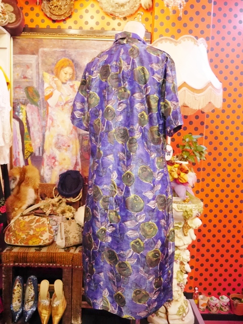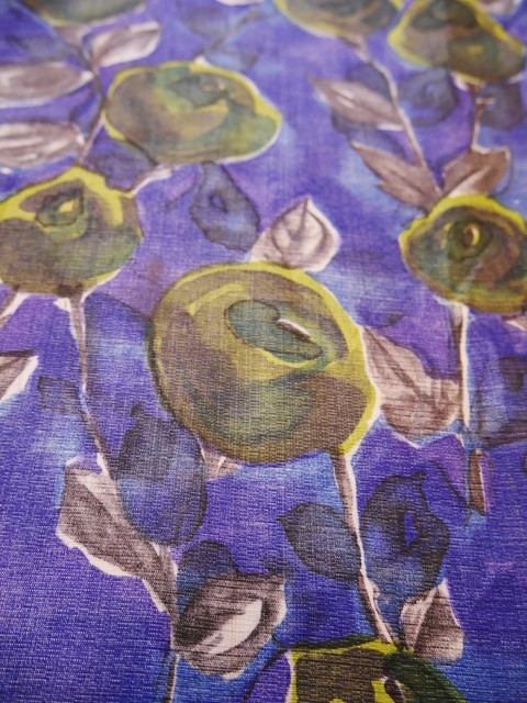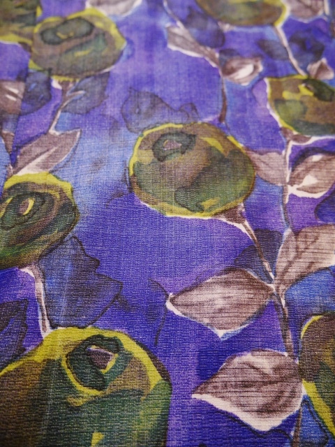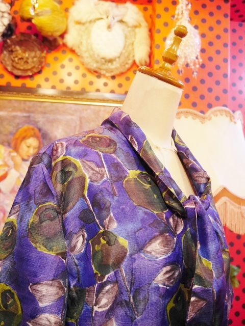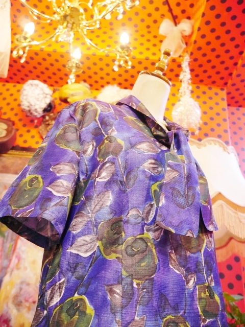 水彩画のようなブルーパープルベースのボディにレトロな花柄模様が魅力的な1950年代頃のヨーロピアンスカーフカラーワンピース アクセントのポイントにウエストマークもおススメ!