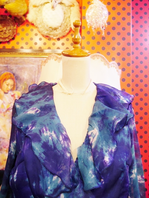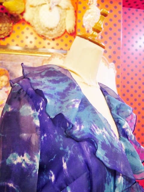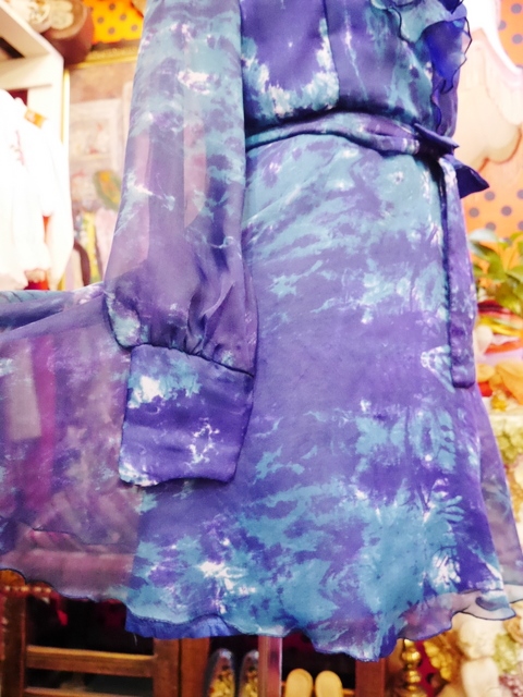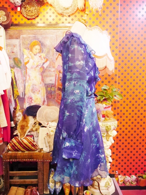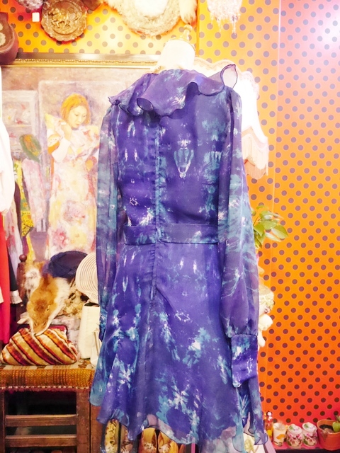 ヨーロッパ古着70sシフォンフリル襟リボンワンピース