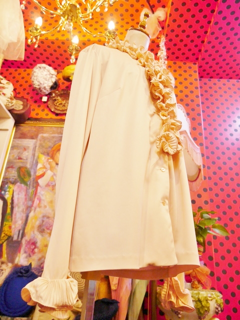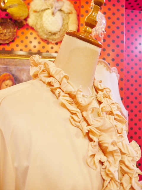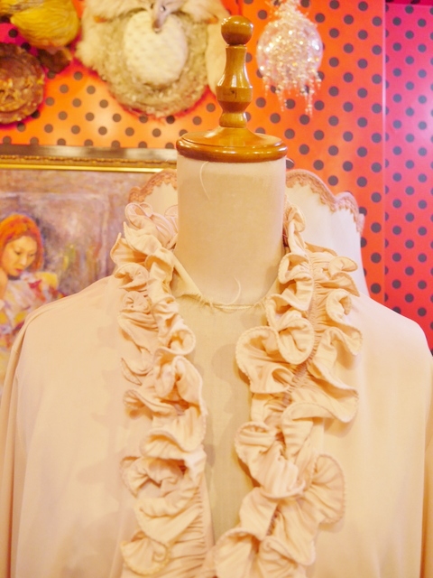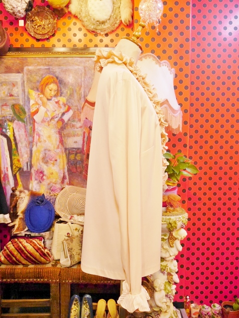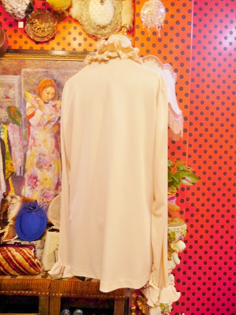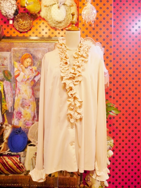 レトロなムードにしあがる襟や袖先のボリュームフリルデザインが魅力的な1970年代頃のヨーロピアンブラウス カーディガン風に着てもお洒落なアイテム!
