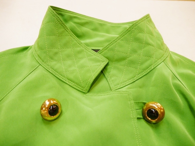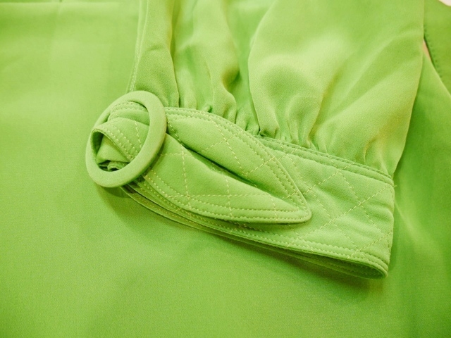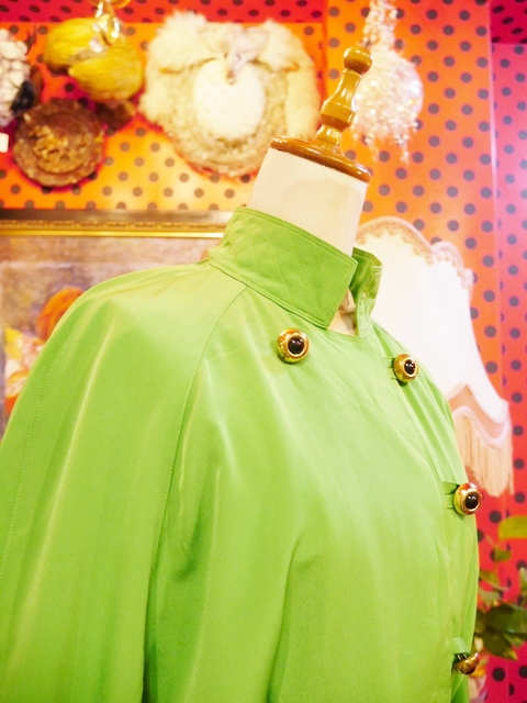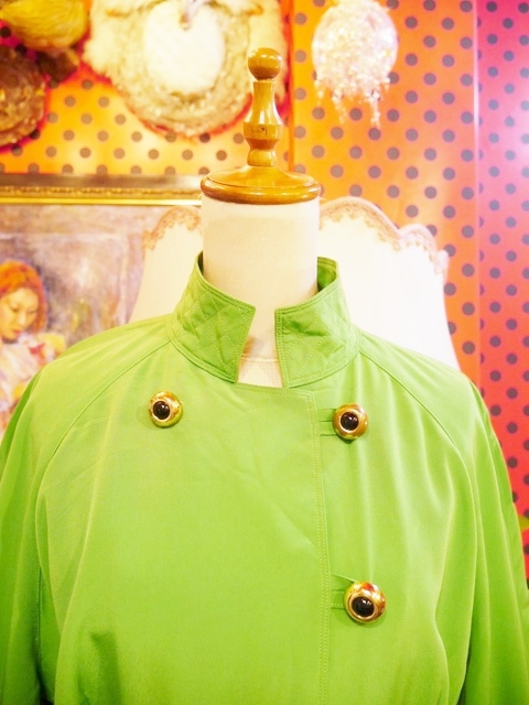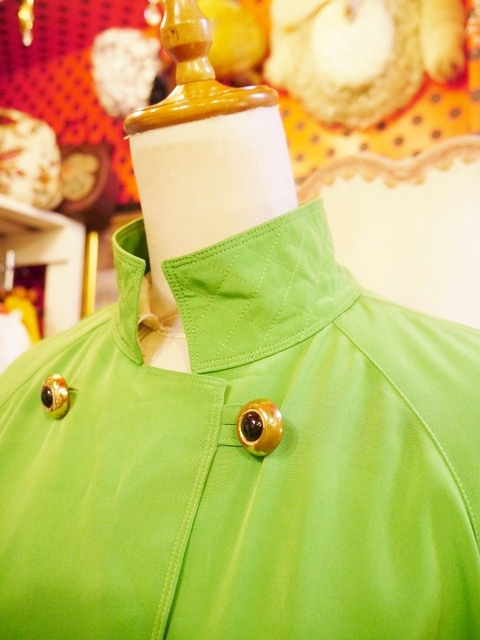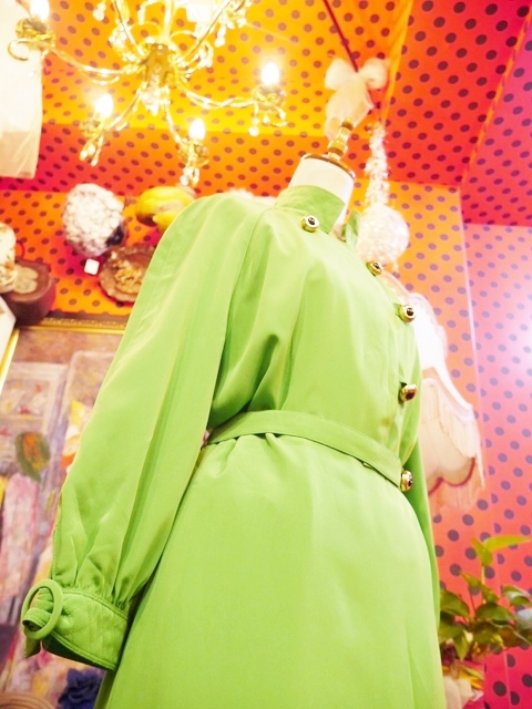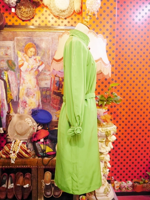 目を惹くビビッドな黄緑色にクールな印象の立ち襟デザイン、大きなレトロボタン、袖先のベルトデザインなどエレガンスにもマニッシュな印象にもなるヨーロピアンヴィンテージワンピース