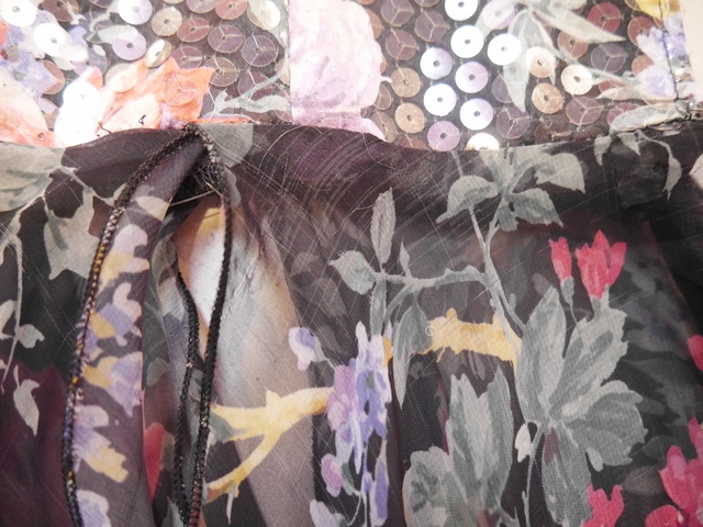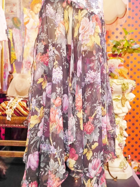 キラキラ輝くクリアスパンコールがデザインされたトップス×4枚のドレープ感がある花柄黒シフォンスカートが魅力的な旧西ドイツ製ヴィンテージパーティドレス スカートやパンツなどレイヤードスタイルが楽しめれるお洒落なデザイン!