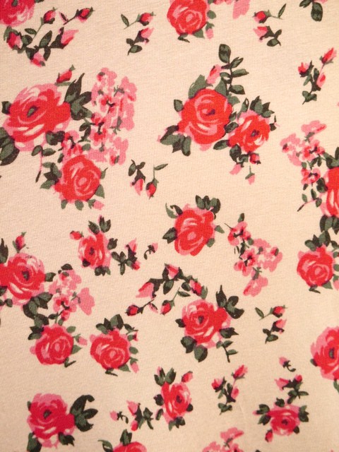赤とピンクカラーのお花模様が可愛らしいヨーロピアントップス ロング丈なのでウエストマークでベルトをしてミニワンピース風もGood!