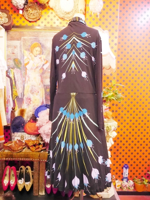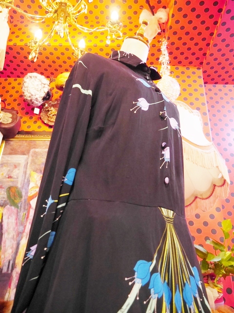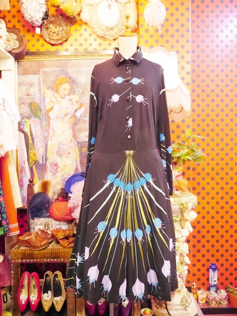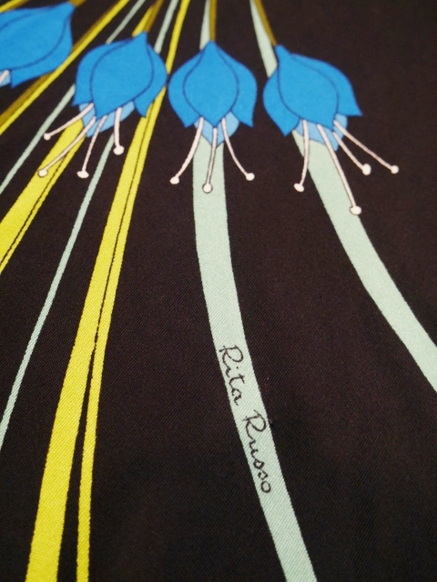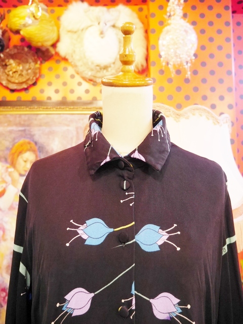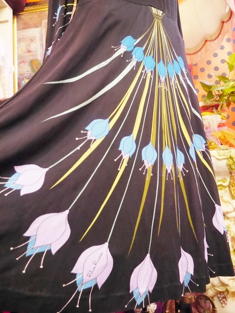 エレガンスなシルクのテロ感に目を惹くレトロモダンなチューリップ柄が魅力的な1960~70年代頃のRitaRussoのヴィンテージドレス アクセントのポイントにウエストマークもおススメ!