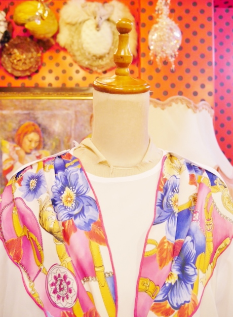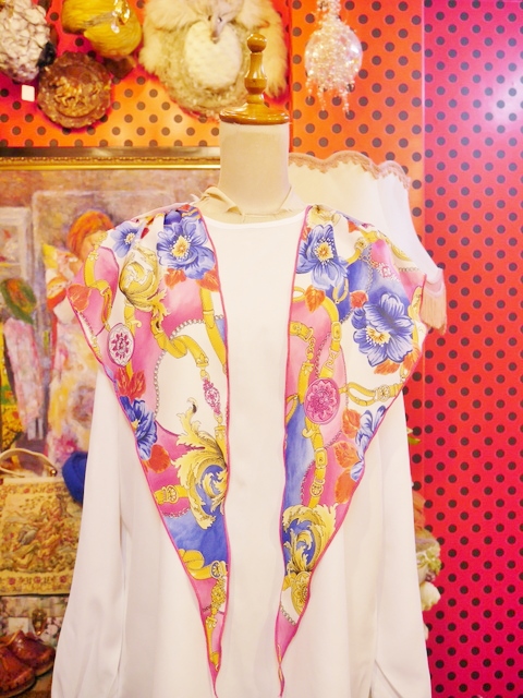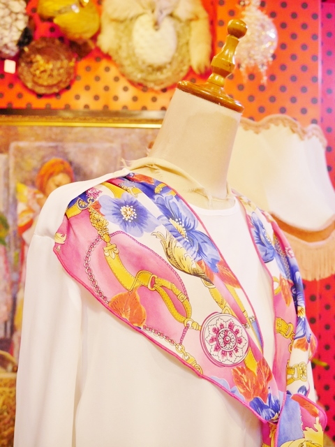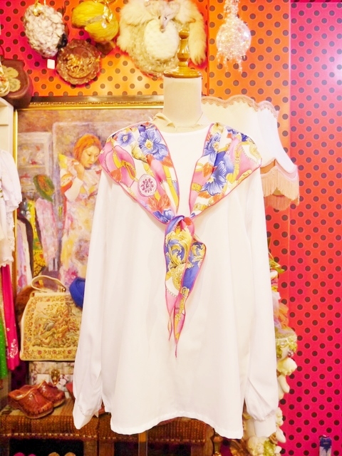 カラフルでエレガントゴージャスなスカーフ付きがお洒落な1980年代頃のヨーロピアンブラウス パンツでもスカートでもカッコ可愛いボトムを選ばないお洒落アイテム!