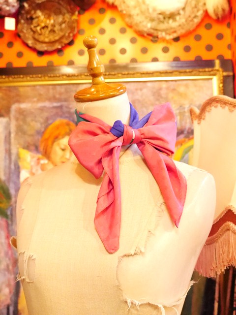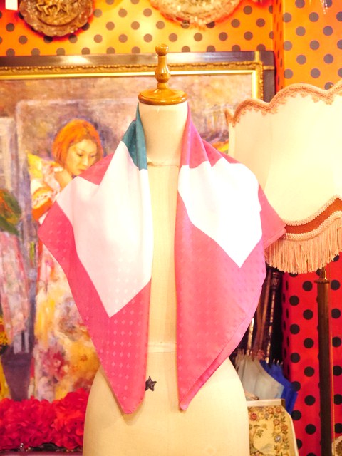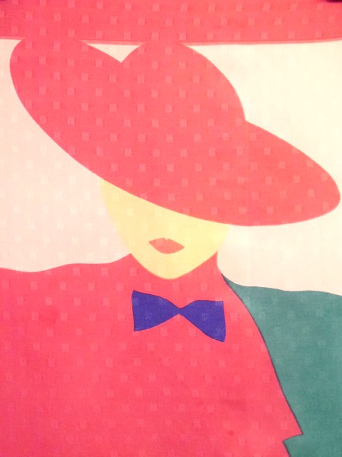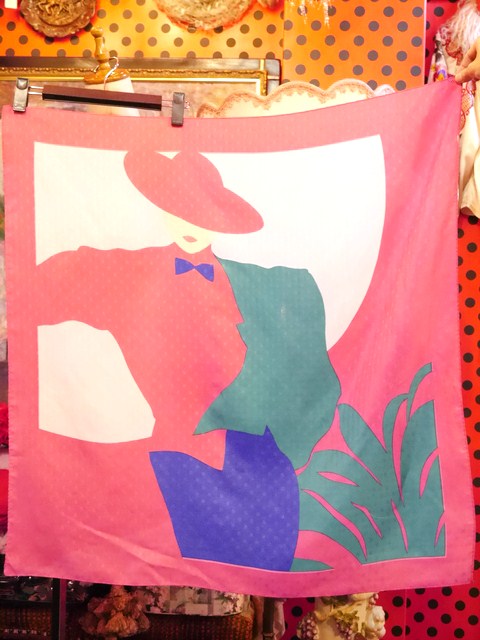 淡いフェミニンな色使いに帽子をかぶったマニッシュスタイルのLady絵柄が魅力のヨーロピアン70sクラシックスカーフ シンプルコーデにプラスするだけでお洒落度UP!ターバンやバッグに付けてもGood!
