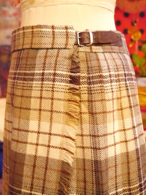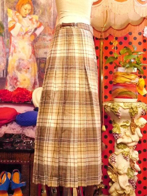 ベージュカラーベースがエレガントな印象のタータンチェックの布をプリーツを作って腰に巻き、ベルトで留めるスタイルのアイルランド製キルトスカート 秋冬のトラッドコーデに取り入れたいアイテム! ★SALE★