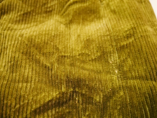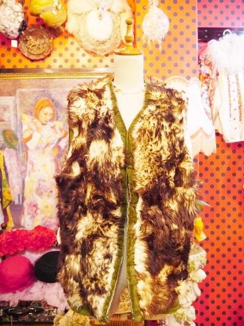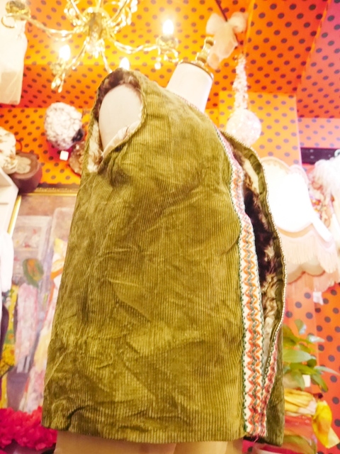 オリーブグリーンのコーデュロイにレトロなチロリアンテープデザインやモジャモジャなムートン裏地が魅力的な1970年代頃のヨーロピアンヒッピーベスト ジャケットやコートにプラスするだけでお洒落度&暖かさUPなヒッピーアイテム ★SALE★