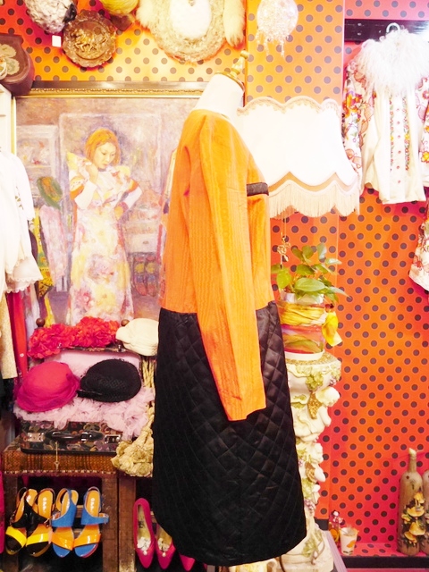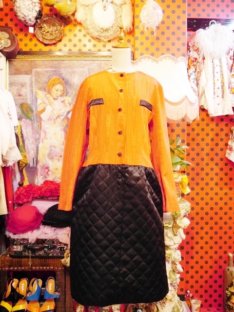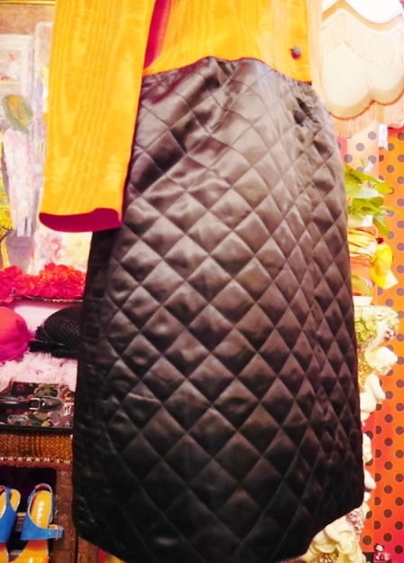 光沢感がある赤トップス×黒のキルティングスカートの異素材MIXデザインがカッコいい1970年代頃のフランス製ヴィンテージドレス アクセントのポイントにウエストマークもおススメ!
