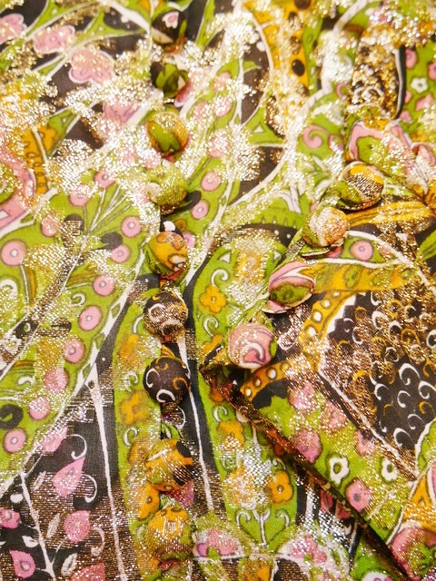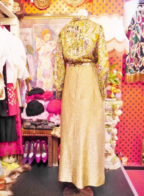 インパクトたっぷりの主役級アイテム!レトロサイケデリック模様×ゴールド刺繍トップスに大人エレガンスなタイトなゴールドラメスカートが魅力的な1970年代頃のヨーロピアンヴィンテージロングドレス