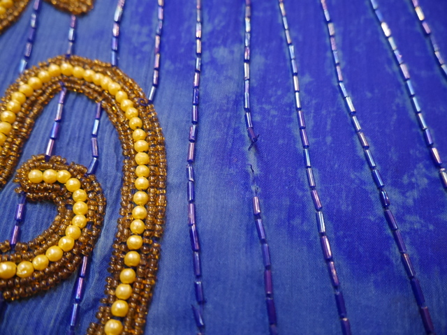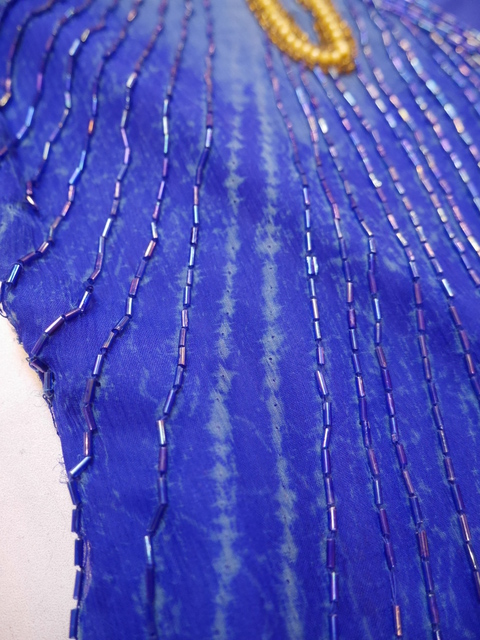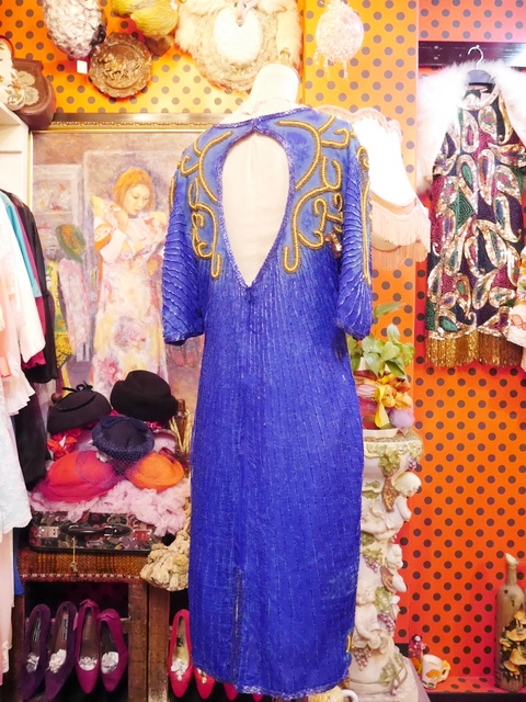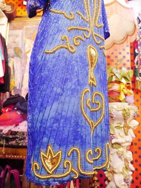 肌触りが良いブルータイダイ染のシルクにインパクトたっぷりの豪華なスパンコールビーズビジューデザインが魅力的なヨーロピアンパーティードレス 背中が大きく開いたバックスタイルがお洒落ポイント!
