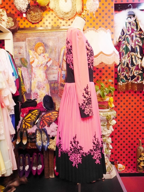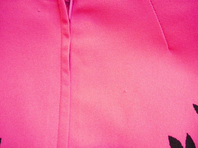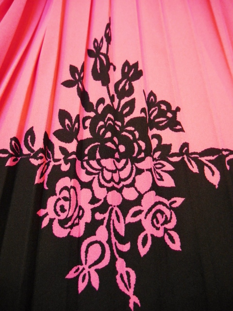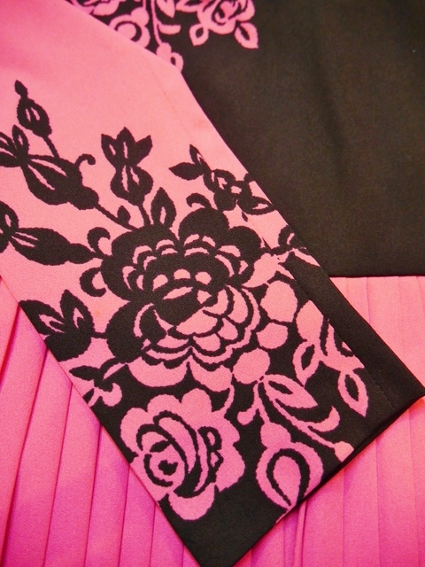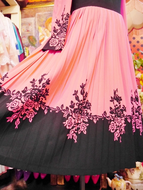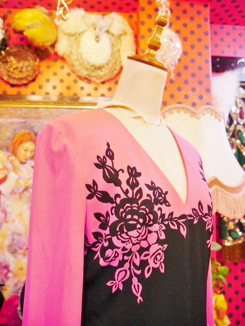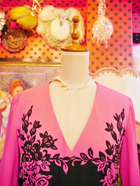 色鮮やかなピンク×黒のエレガンスな花柄切替デザインが魅力的な1970年代頃のヨーロピアンヴィンテージワンピース アクセントのポイントにウエストマークもおススメ!