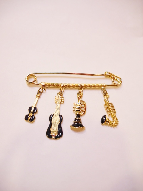 ゴールド×黒のギターやトランペット、サックスのユラユラ揺れるパーツでデザインされた1970年代頃のピンブローチ ベルギーのアンティークショップで見つけたブラウスやバッグ、帽子に付けるとお洒落度UPなヴィンテージアクセサリー