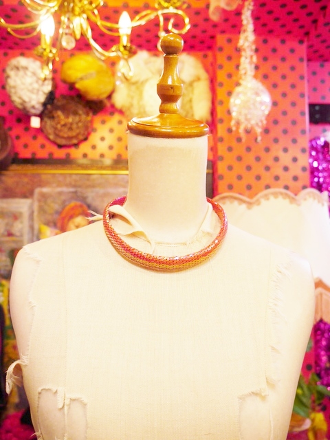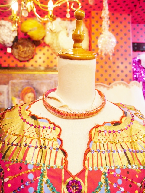 キラキラ輝くメタリックピンク鱗が個性的でインパクトたっぷり!プラスするだけでスタイリングを何倍にも輝かせてくれる1970年代ヨーロピアンヴィンテージ鱗チョーカーネックレス パーティやイベントにおススメ!
