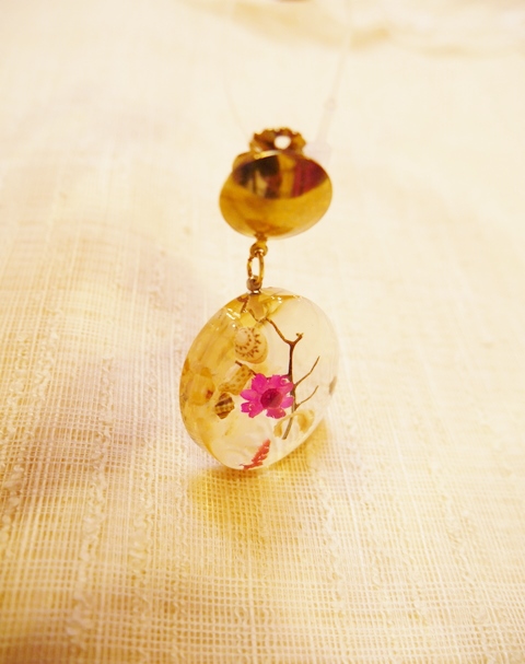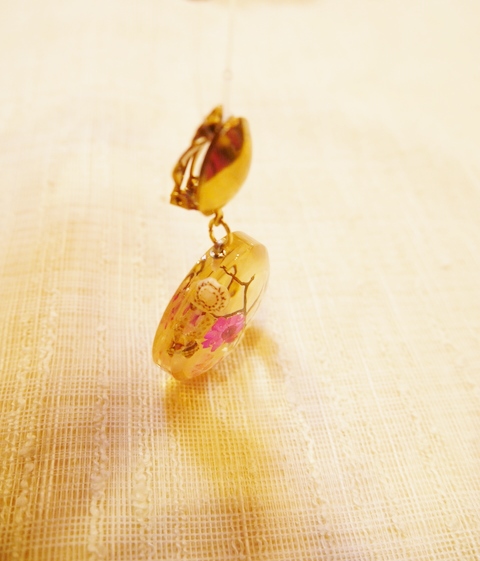 貝殻やお花、小枝が閉じ込められ丸いフォルムが可愛らしい1960年代頃のヨーロピアンルーサイトイヤリング 薄く黄色がかった色合いがアンティーク感漂うフォークロアガーリーなアイテム