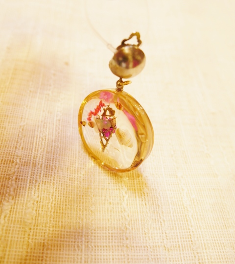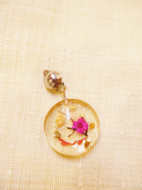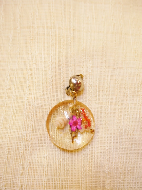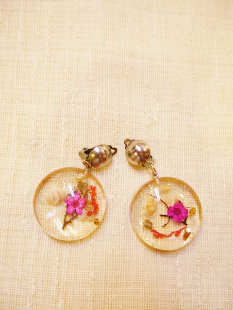 貝殻やお花、小枝が閉じ込められ丸いフォルムが可愛らしい1960年代頃のヨーロピアンルーサイトアクリル樹脂イヤリング 薄く黄色がかった色合いがアンティーク感漂うフォークロアガーリーなアイテム