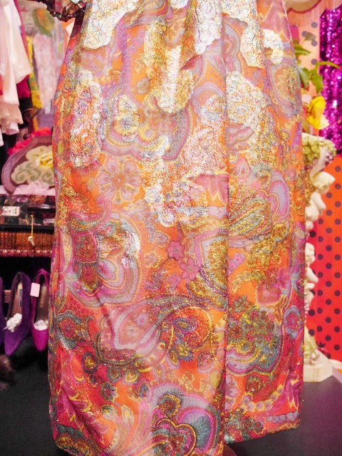 レトロエレガンスなサイケデリック柄がプリントされた赤シフォン生地に七色に輝くメタリックなペイズリー模様がデザインされたインパクトたっぷりの1970年代ヴィンテージロングドレス セクシーな透け感があるボリューム袖がお洒落ポイント!アクセントのポイントにウエストマークもおススメ!