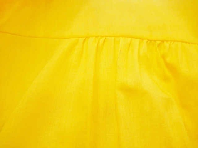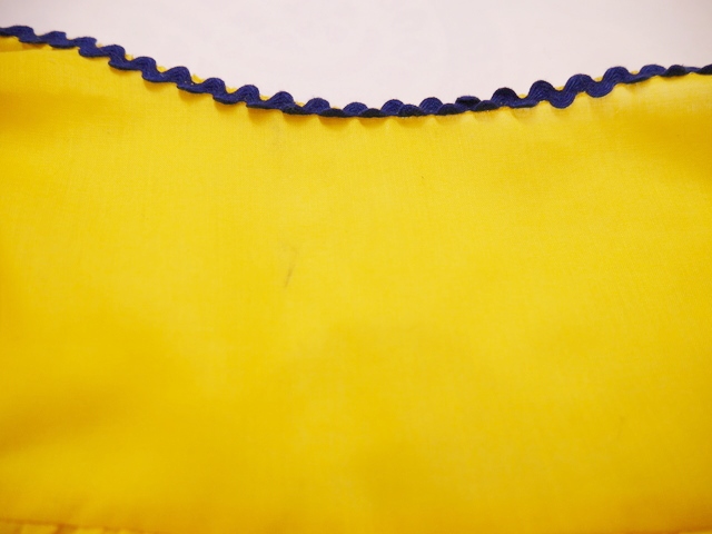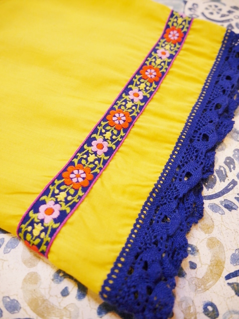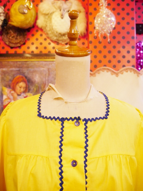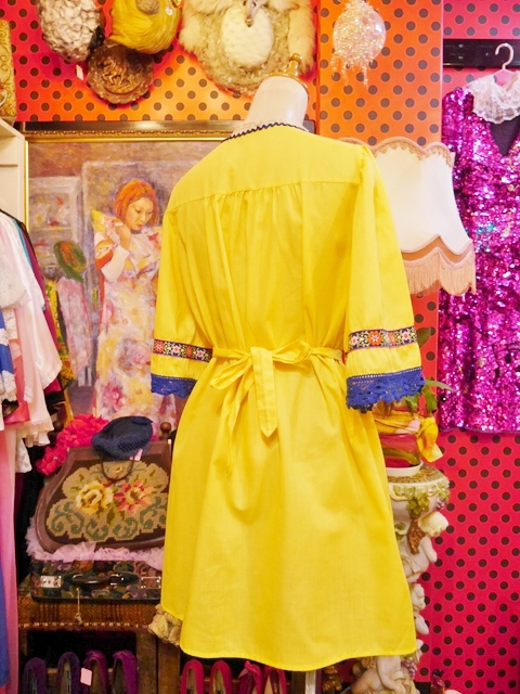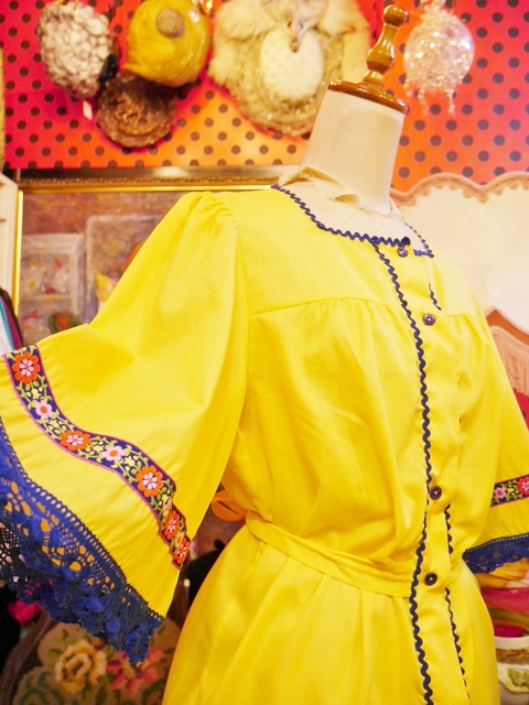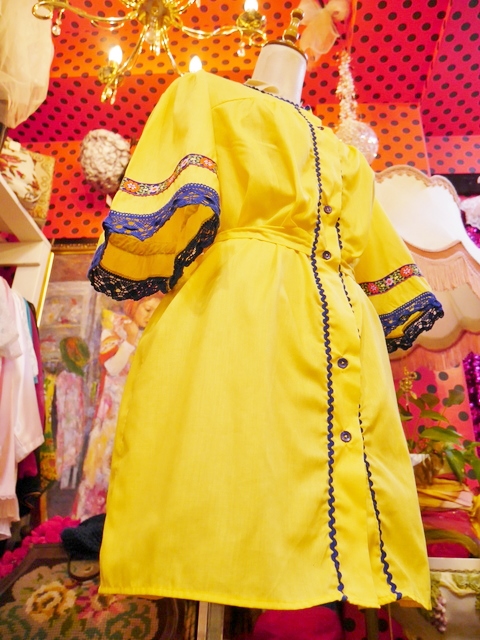 色鮮やかな黄色にカラフルポップなチロリアンテープやブルーのレースデザインが可愛らしい1970年代頃のヨーロピアンミニワンピース ウエストリボンデザインがお洒落ポイント!
