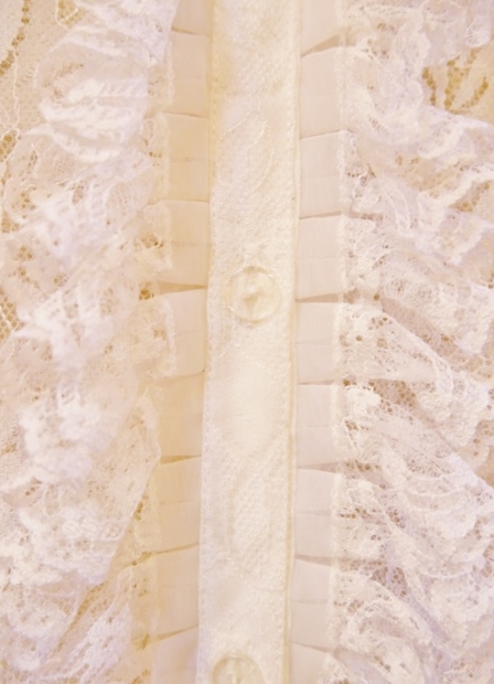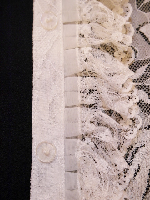 エレガンスな透け感に繊細かつ華やかな花柄、リーフ模様のレースデザインが魅力的な1970年代頃のヨーロピアンヴィンテージブラウス 前立て部分のボリューミーなシフォン×レースフリルがお洒落ポイント!大人ヴィンテージスタイルにプラスしたい一枚!★SALE★