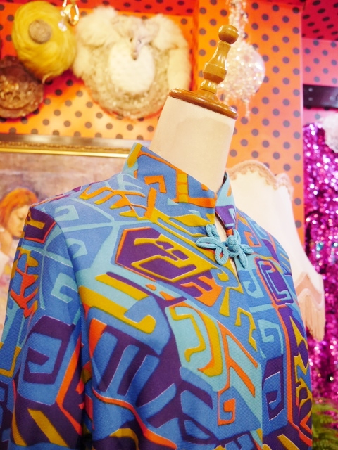 目を惹くカラフルなジオメトリック柄にクールな印象の立ち襟×アジアンノットが魅力的な1970年代頃のヴィンテージワンピース アクセントのポイントにウエストマークもおススメ!