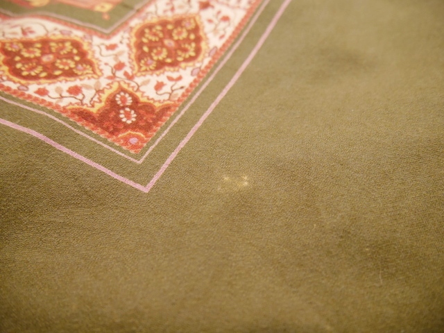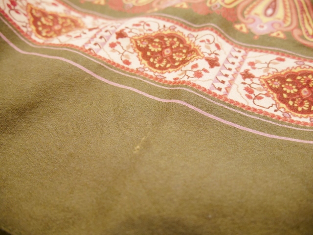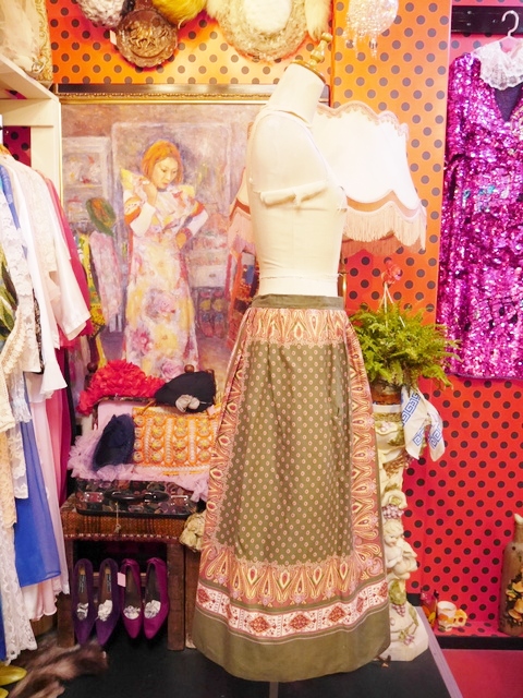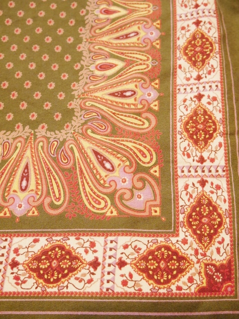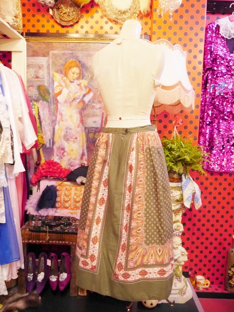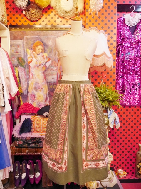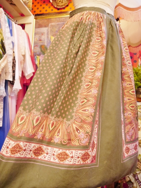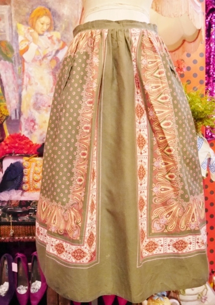 オリーブベースにレトロカントリーなバンダナ柄が可愛らしい1970年代頃のヨーロピアンスカート トップスを選ばないお洒落スカート!