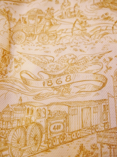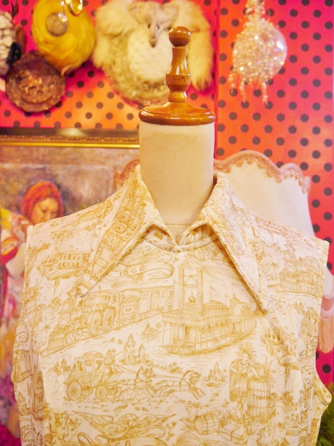 馬車や機関車など1868年の風景が描かれたレトロプリントにプリーツスカートが大人ガーリーな印象の1970年代ヴィンテージワンピース アクセントのポイントにウエストマークもおススメ!