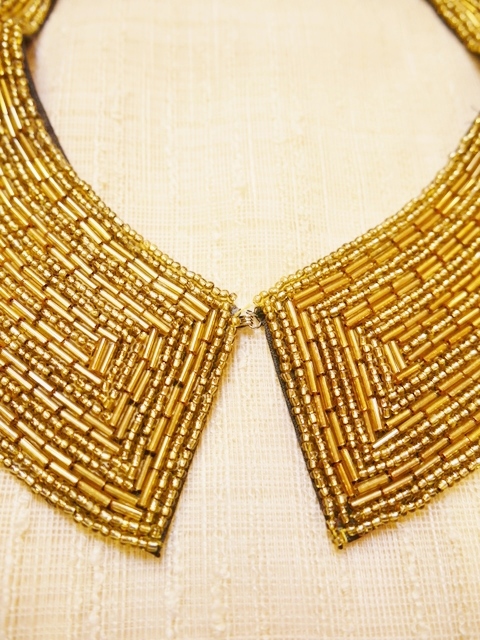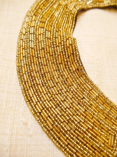 アンティークゴールド色の小さい粒のシードビーズと丸みがある長方形の竹ビーズがビッシリ詰まった1950年代頃のヨーロピアン付け襟 落ち着いた雰囲気の中にエレガンスな輝きが魅力的!パーティーやイベント衣装におススメ!